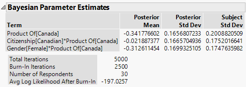 (Appears only if Hierarchical Bayes is selected on the launch window.) The Bayesian Parameter Estimates report gives results for model effects. The estimates are based on a Hierarchical Bayes fit that integrates the subject-level covariates into the likelihood function and estimates their effects on the parameters directly. The subject-level covariates are estimated using a version of the algorithm described in Train (2001), which incorporates Adaptive Bayes and Metropolis-Hastings approaches. Posterior means and variances are calculated for each model effect. The algorithm also provides subject-specific estimates of the model effect parameters. See Save Subject Estimates.