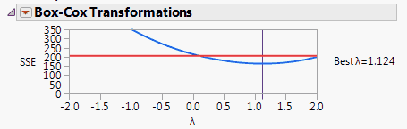 The Box Cox Y Transformation option fits transformations from λ = –2 to 2 in increments of 0.2. To choose a proper value of λ, the likelihood function for each of these transformations is computed. They are computed under the assumption that the errors are independent and normal with mean zero and variance σ2. The value of λ that maximizes the likelihood is selected. This value also minimizes the SSE over the selected values of λ.