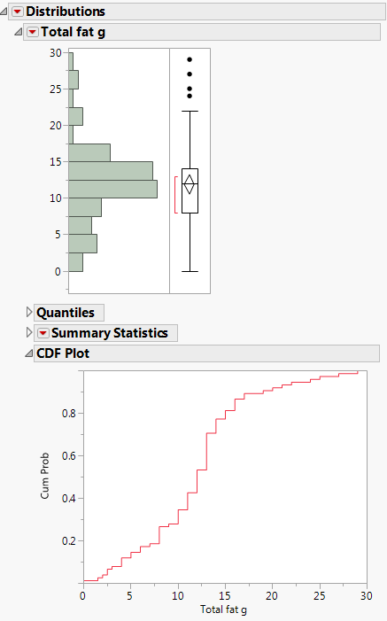 For example, in this CDF plot, approximately 30% of the data is less than a total fat value of 10 grams.