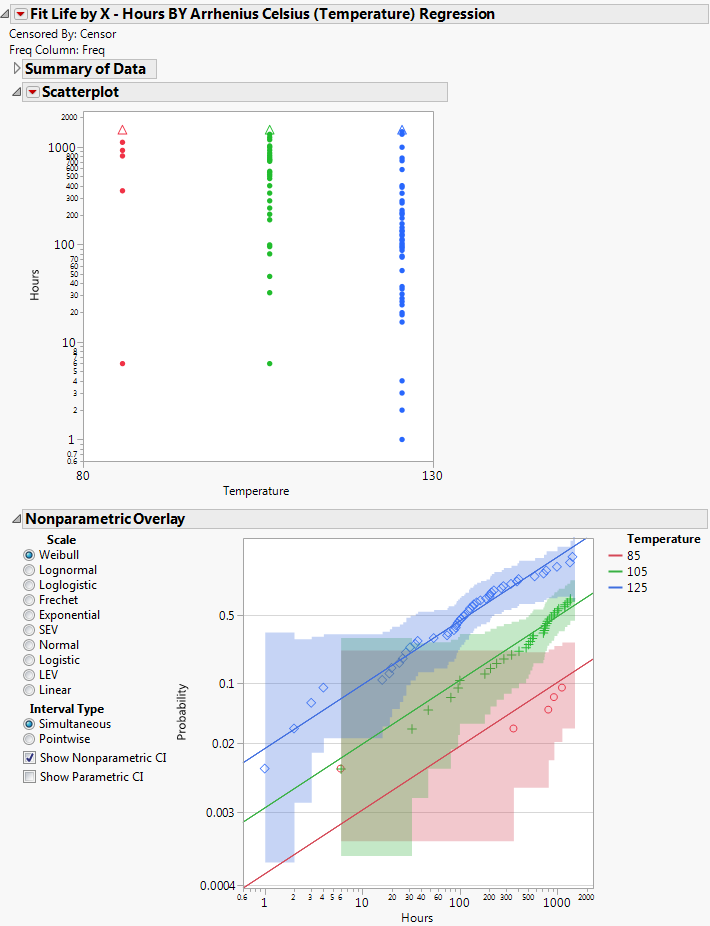 This example uses Capacitor ALT.jmp and can be found in the Reliability folder of the sample data. It contains simulated data that gives censored observations for three levels of temperature, for a reliability study. Observations are shown as censored values at temperature levels of 85, 105, and 125 degrees Celsius.