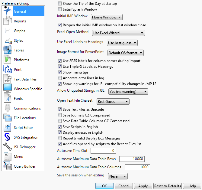You can change preferences in JMP using the Preferences window. To open the Preferences window, select