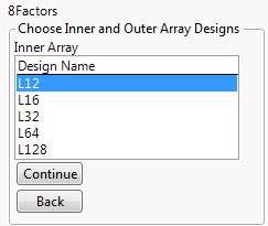 Your choice for inner and outer arrays depends on the number and type of factors you have. Selecting a Design for Eight Signal Factors shows the available inner array choices when you have eight signal factors. If you also have noise factors, choices include designs for the outer array. To follow along, enter eight two-level Signal factors and click Continue. Then highlight the design you want and again click Continue. This example uses the L12 design.