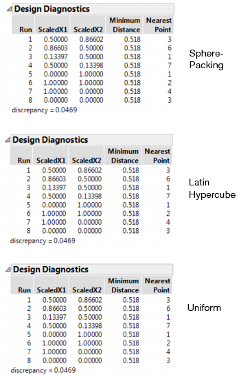 Comparison of Diagnostics for Three Eight-Run Space-Filling Methods shows a comparison of the design diagnostics for three eight-run space-filling designs. Note that the discrepancy for the Uniform design is the smallest (best). The discrepancy for the Sphere-Packing design is the largest (worst). The discrepancy for the Latin Hypercube takes an intermediate value that is closer to the optimal value.