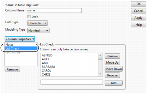 Caution: In a column with the List Check property, you can enter only a value that is in the list. Otherwise, JMP warns that the cell contains invalid data when you try to enter the new value. For details, see List Check.