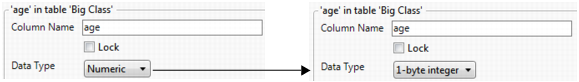 Note: To compress a numeric column manually, set your Tables preferences to allow short numeric data and then change the column’s data type to 1-byte integer, 2-byte integer, or 4-byte integer. For details about this preference, see Tables in JMP Preferences.