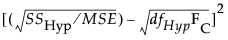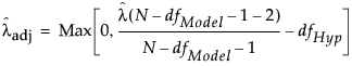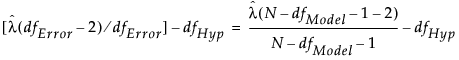 The expression on the right illustrates the calculation of the unbiased noncentrality parameter when a sample size N, different from the study size n, is proposed for a retrospective power analysis. Here, dfHyp represents the degrees of freedom for the hypothesis and dfModel represents the degrees of freedom for the whole model.