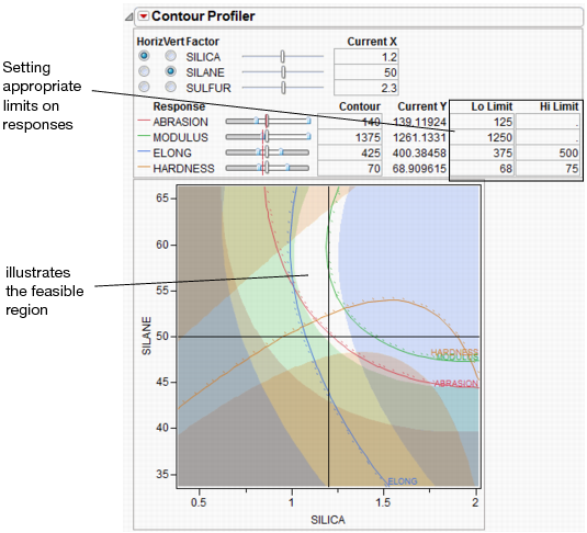 If you specify limits for the response columns, the areas of the plot that are outside of the feasible region are shaded. The unshaded white area represents the feasible region. See
