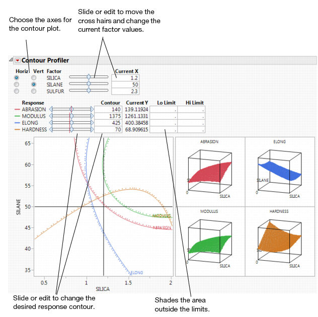 Use the interactive Contour Profiler for optimizing response surfaces graphically. The Contour Profiler shows contours for the fitted model for two factors at a time. The report also includes a surface plot.