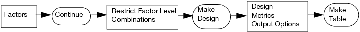 The covering array window updates as you work through the design steps. For more information about the general flow of DOE windows, see The DOE Workflow: Describe, Specify, Design. The outlines, separated by buttons that update the outlines, follow the flow in Covering Array Flow.