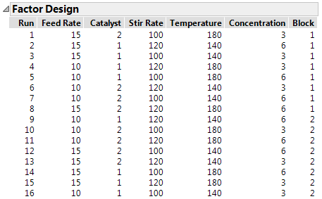 Select Feed Rate, Catalyst, Stir Rate, Temperature, and Concentration and click X, Factor.