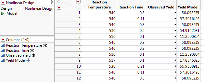Now that you have created your design table, run your experiment, and record the responses in the Observed Yield column. From this point on, work with the data table Reaction Kinetics.jmp, found in the Design Experiment folder.