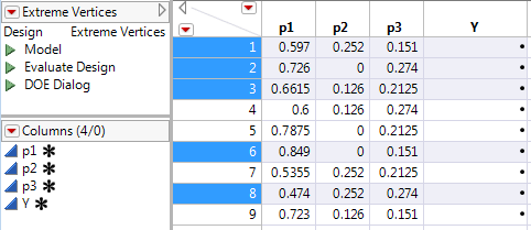 Click Make Table. JMP uses the 9 factor settings to generate a JMP table (Extreme Vertices Mixture Design).