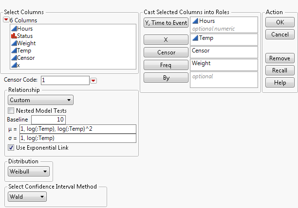 Select Hours and click Y, Time to Event, Temp and click X, Censor and click Censor, and Weight and click Freq.