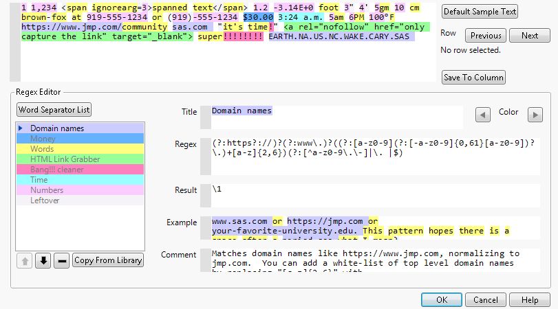 When you select the Customize Regex option, the Text Explorer Regular Expression Editor appears. Use this window to parse text documents using a wide variety of built-in regular expressions, such as phone numbers, times, or monetary values. You can also create your own regular expression definitions.