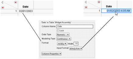 In data tables, JMP can accept the input of date-time values in one format (the input format), store them internally as the number of seconds since the base date, and display them in a different date-time format. The Informat() and Format() functions give you this control.