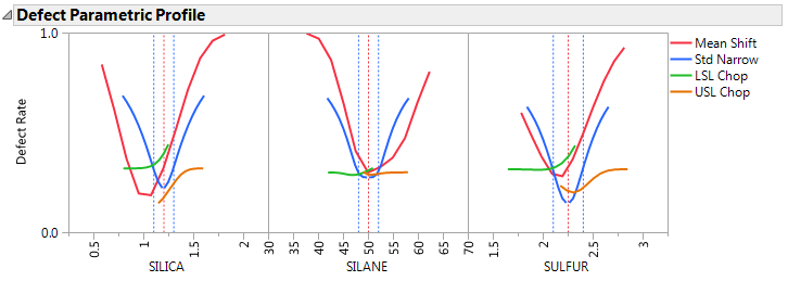 The defect parametric profiler shows the impact of process changes on the defect rate. The impacts are based on the simulation parameter settings for each factor. Four scenarios are considered.