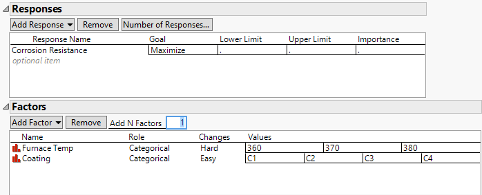 Responses and Factors for Box Corrosion Split-Plot Experiment shows the Responses and Factors outline using the Custom Design platform for constructing the design in the Box Corrosion Split-Plot.jmp sample data table, located in the Design Experiment folder. Also shown is the Define Factor Constraints outline, which appears once you click Continue. The Define Constraints outline enables you to specify restrictions that your factor settings must satisfy.