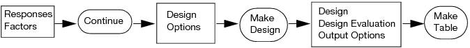 The definitive screening design window updates as you work through the design steps. For more information, see The DOE Workflow: Describe, Specify, Design in Starting Out with DOE. The outlines, separated by buttons that update the outlines, follow the flow in Definitive Screening Design Flow.