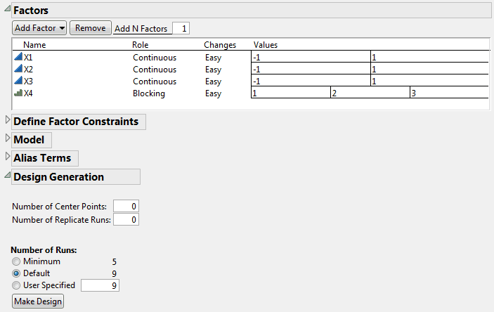 The Factors outline now shows an appropriate number of blocks, calculated as the Default run size divided by the number of runs per block. For this example, the default sample size of 9 requires three blocks. The Factors outline now shows that X4 has three values, indicating the three blocks.