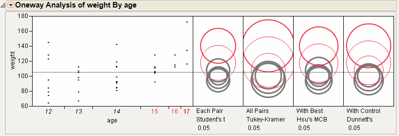 From Comparison Circles for Four Multiple Comparison Tests, notice that for the Student’s t and Hsu methods, age group 15 (the third circle from the top) is significantly different from the control group and appears gray. But, for the Tukey and Dunnett method, age group 15 is not significantly different, and appears red.