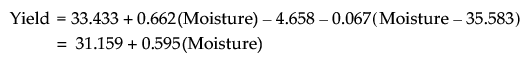 In the Model Specification window, the Center Polynomials option is selected by default. Because of this, the Moisture effect is centered at its mean of 35.583, as stated in the note at the top of the Variety report. From the Fixed Effects Parameter Estimates and Random Coefficients reports, you obtain the following prediction equation for Variety 2: