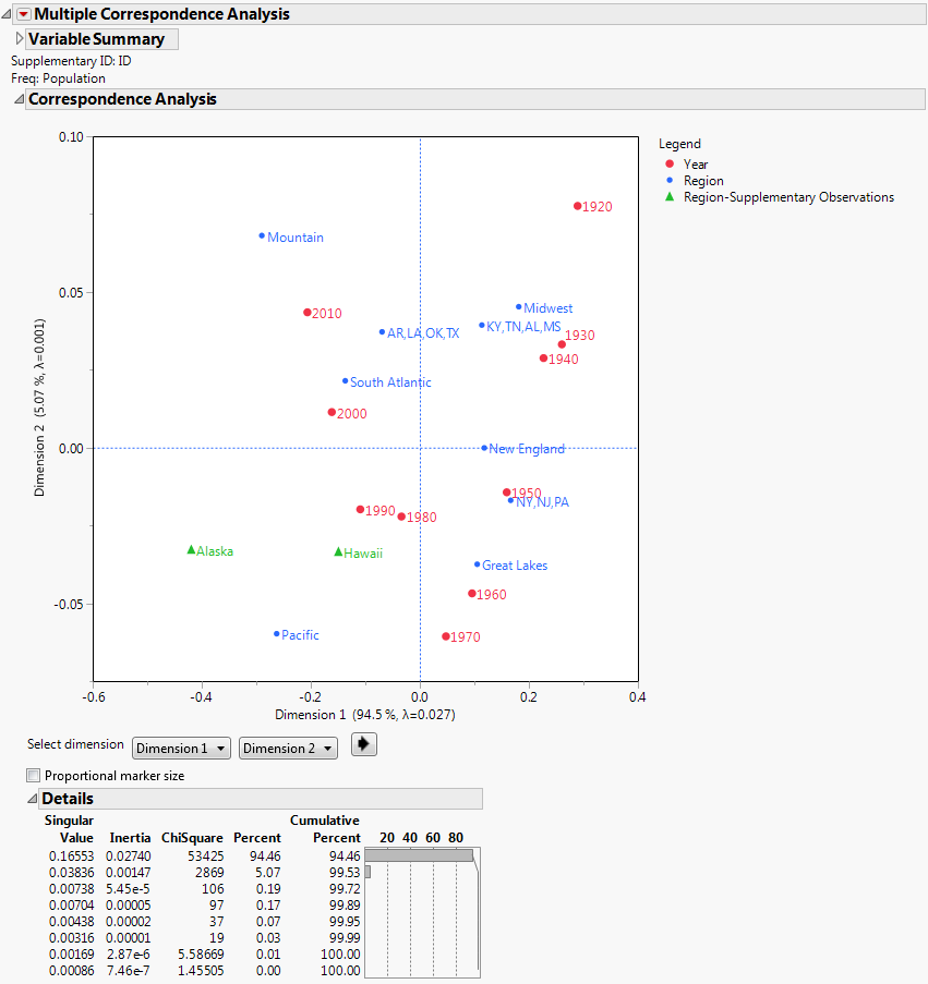 The United States census allows for examining population growth over the last century. The US Regional Population.jmp sample data table contains populations of the 50 US states grouped into regions for each of the census years from 1920 to 2010. Alaska and Hawaii are treated as supplementary regions because they were not states during the entire time, and they are not part of the contiguous United States. You are interested in whether the population growth in these two states differs from the rest of the US.