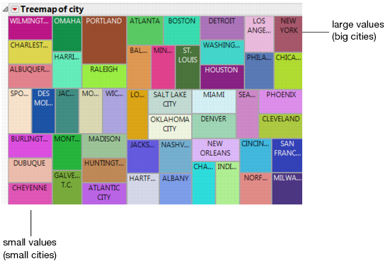 The report window appears. Since you specified an Ordering variable, the cities in the treemap are ordered from bottom left (small cities) to upper right (big cities).