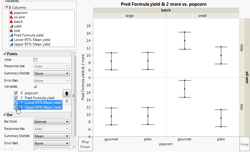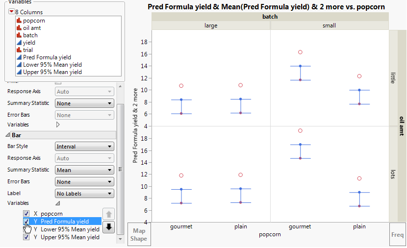 Format the graph to see interval bars for Lower 95% Mean yield and Upper 95% Mean yield, and to see points for Pred Formula yield.