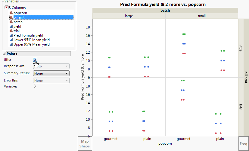 In the Effect Summary report, notice that the popcorn*batch interaction has a small p-value (0.00261). From this, you conclude that there is a significant interaction between popcorn and batch.