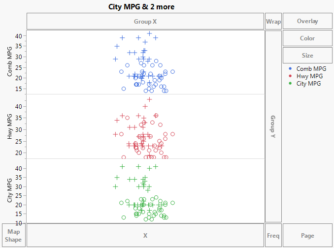 Because markers are assigned to rows in the data table, points are represented by those markers. The value of Comb MPG for each row is plotted at its value on the vertical axis. To avoid over-plotting points that correspond to observations with the same Comb MPG values, JMP randomly jitters the points.