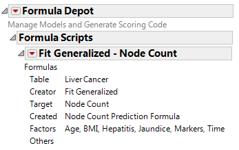 To add the prediction formula to the data table, select Run Script from the Fit Generalized - Node Count red triangle menu in the Formula Depot.