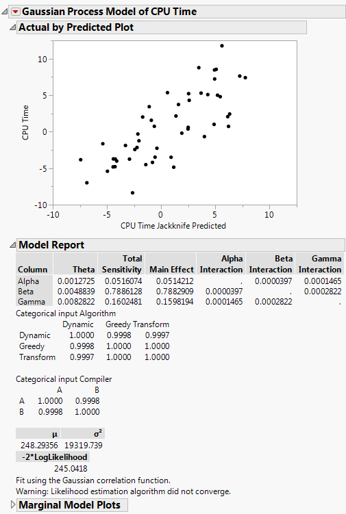 The actual by predicted plot shows a strong correlation between the actual and predicted CPU times. This in an indication that the Gaussian process prediction model is a good approximation of the true function. In the Model Report, the Beta predictor has the highest total sensitivity. This indicates that of the continuous predictors, Beta explains the most variation in the response. There is a separate Categorical Input matrix for each of the categorical predictors, Algorithm and Compiler. These matrices are correlation matrices and show the correlation between levels for each categorical predictor. The off-diagonals of the matrices are the τ parameters.