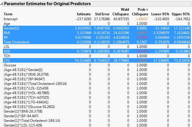 The data in the Diabetes.jmp sample data table consist of measurements on 442 diabetics. The response of interest is Y, disease progression measured one year after a baseline measure was taken. Ten variables thought to be related to disease progression are also measured at baseline. This example shows how to develop a predictive model using generalized regression techniques.
