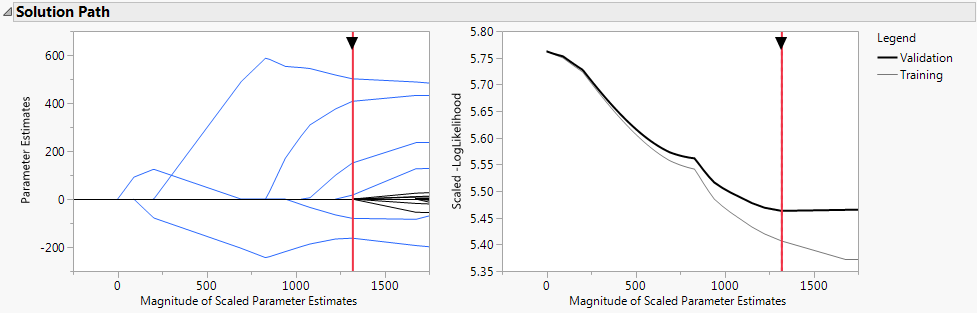 An Adaptive Lasso with Validation Column report appears. The Solution Path report (Solution Path Plot) shows plots of the parameter estimates and scaled negative log-likelihood. The shrinkage increases as the Magnitude of Scaled Parameter Estimates decreases. The estimates at the far right of the plot are the maximum likelihood estimates. A vertical red line indicates those parameter values selected by the validation criterion, in this case, the holdback sample defined by the column Validation.