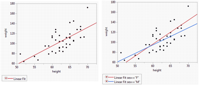 The scatterplot to the left in Example of Regression Analysis for Whole Sample and Grouped Sample has a single regression line that relates weight to height. The scatterplot to the right shows separate regression lines for males and females.
