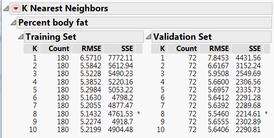 The K = 8 model had the lowest RMSE for the Validation set. Among k nearest neighbor models, the model based on 8 nearest neighbors seems to perform the best.