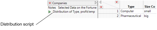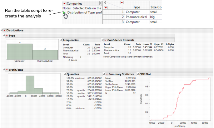 To save this analysis, select Save Script > To Data Table from the red triangle menu for Distributions. The new script appears in the Table panel.