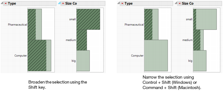 You can see the type distribution of small and medium sized companies. See Selecting Data in Multiple Histograms at left. To narrow your selection, you want to see the small and medium pharmaceutical companies only.