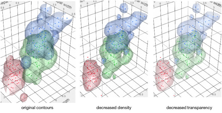 The options for formatting the grouped and ungrouped nonparametric density contours are similar. The only difference is that you cannot change the color of each grouped nonparametric density contour. See Scatterplot 3D Platform Options for options.