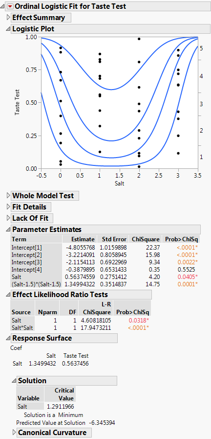 The report shows how the quadratic model fits the response probabilities. The curves, instead of being shifted logistic curves, become stacked U-shaped curves where each curve achieves its minimum at the same point. The critical value is at Mean(X)–0.5 * (b1/b2) where b1 is the linear coefficient and b2 is the quadratic coefficient. This formula is for centered X. From the Parameter Estimates table, you can compute that the optimal amount of salt is 1.5 - 0.5 * (0.5637/1.3499) = 1.29 teaspoons.