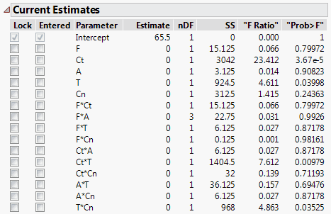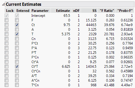 When there are significant interaction terms, several terms can enter at the same step. If the Step button is clicked twice, Ct*T is entered along with its two contained effects Ct and T. However, a step back is not symmetric because a crossed term can be removed without removing its two component terms. Notice that Ct and T now each have 2 degrees of freedom. This is because if Stepwise removes Ct or T, it must also remove Ct*T. If you change the Direction to Backward and click Step, Ct*T is removed and the degrees of freedom for Ct and T change to 1.