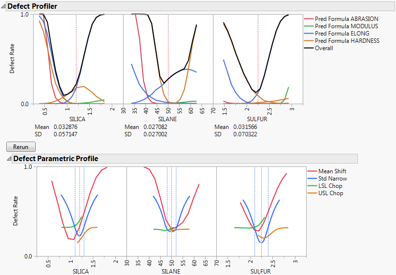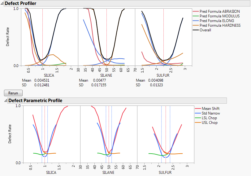 Select Defect Profiler from the Simulator red triangle menu to see the defect profiles. The curves, Means, and SDs will change from simulation to simulation, but will be relatively consistent.
