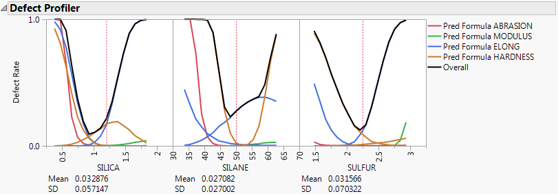 To show a common workflow with the Defect profiler, we use Tiretread.jmp. The experimental data in the Tiretread.jmp sample data table results from an experiment to study the effects of SILICA, SILANE, and SULFUR on four measures of tire tread performance.