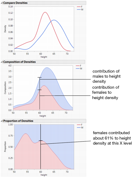 From the red triangle menu, select Densities > Compare Densities, Densities > Composition of Densities, and Densities > Proportion of Densities.