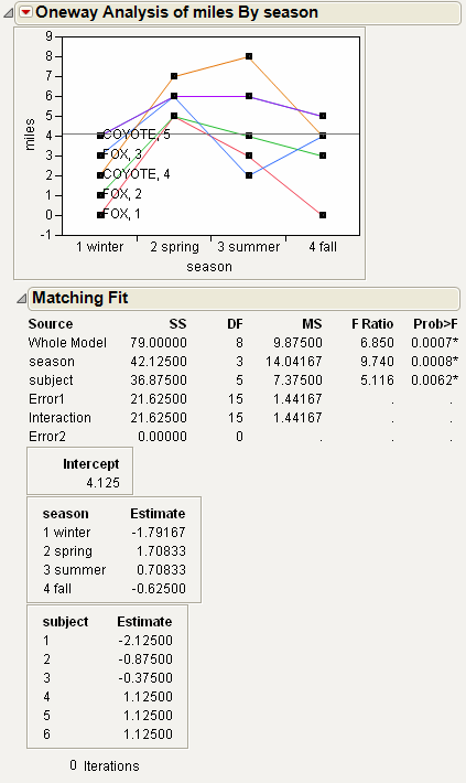 This example uses the Matching.jmp sample data table, which contains data on six animals and the miles that they travel during different seasons.