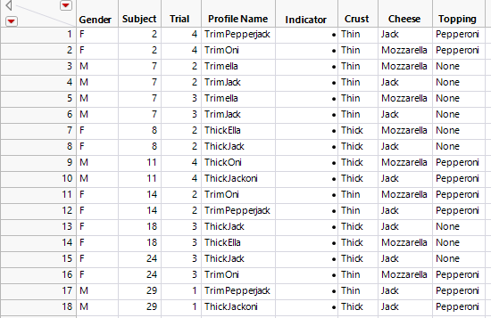 In the table in Choice Sets with No Choice Responses, consider the profiles in the first seven choice sets, which are defined by the Subject and Trial combinations in rows 1 to 14. The only difference within each choice set is the Cheese. There is an indication that some respondents might not be able to detect the difference in cheeses. However, the analysis takes the No Choice Indicator into account and concludes that, despite this behavior, Cheese is significant.