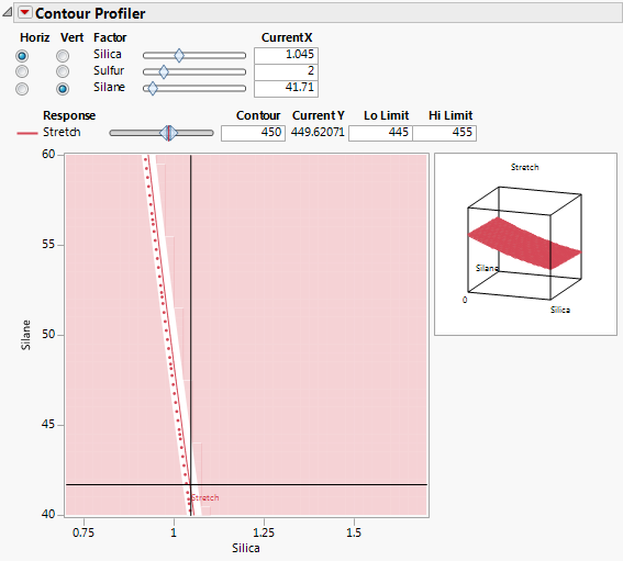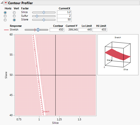 Click the Response Stretch red triangle menu and select Factor Profiling > Contour Profiler. Suppose that you want to achieve your target while setting Sulfur to the value 2.0. Also, you want to make sure that the settings that you choose for Silane and Silica maintain predicted Stretch within 5 units of 450.