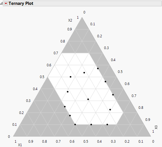 The ternary plot shows the feasible region as defined by the factor limits (the linear constraints are not considered in the shading). The design points are at the six vertices of the feasible region, at the six edge mid-points, and the overall centroid. For details about ternary plots see Ternary Plot Overview.