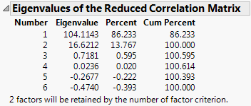 Eigenvalues of the Reduced Correlation Matrix indicates that the first two factors account for 100% of the common variance. This pattern suggests that you might not need more than two factors to model your data.