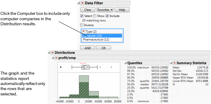 Use the Data Filter to interactively select complex subsets of data, hide these subsets in plots, or exclude them from analyses. For example, look at profit per employee for computer and pharmaceutical companies.